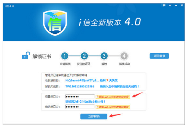 短信驗證通過后或者管理員審批完成后,即看到如下界面,輸入新的口令(要求至少8位且必須字母和數(shù)字組合),點擊【立即解鎖】,