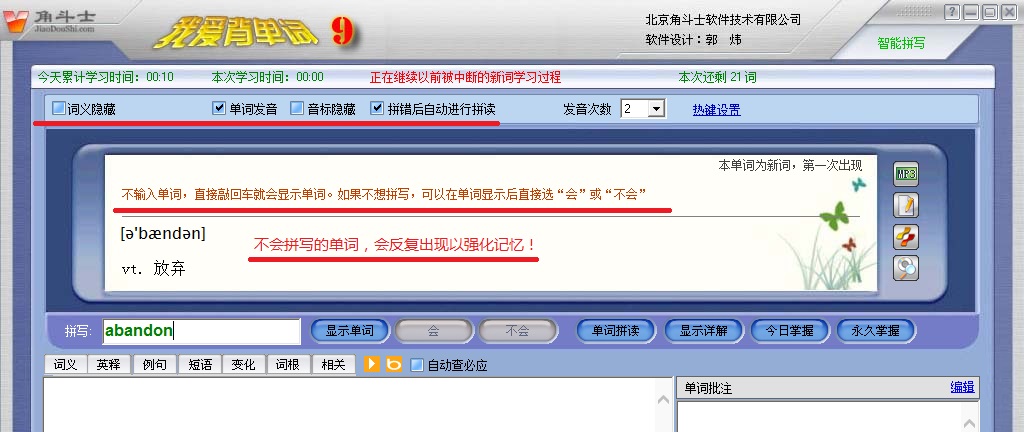 我愛(ài)背單詞軟件(記單詞軟件)在凝結(jié)了社會(huì)心理學(xué),認(rèn)知能力學(xué),應(yīng)用語(yǔ)言學(xué)多課程科研成果的根基上,綜合性完成了“智能化艾賓浩斯即時(shí)動(dòng)規(guī)記憶方法”。我愛(ài)背單詞軟件(記單詞軟件)是一個(gè)相對(duì)高度自動(dòng)化的記憶力數(shù)據(jù)管理系統(tǒng),能即時(shí)剖析人的大腦記憶力的轉(zhuǎn)變?nèi)^(guò)程,動(dòng)態(tài)規(guī)劃人性化的最佳學(xué)習(xí)培訓(xùn)記憶力次序,進(jìn)而實(shí)現(xiàn)更強(qiáng)學(xué)習(xí)效率。用此方式背單詞,您徹底不要操勞每日該學(xué)什么單詞,備考什么單詞,只需跟隨軟件分配的學(xué)就可以了!并且沒(méi)有強(qiáng)制的方案要求,您隨時(shí)隨地都能夠想學(xué)入學(xué),想停就停,而并不會(huì)危害學(xué)習(xí)效率!。