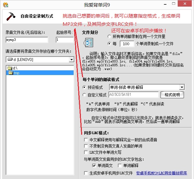 3.隨意挑選單詞制作格式靈活可變的單詞MP3+LRC,并可以在安卓手機(jī)上同步播放!