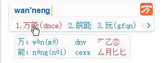 使用萬能五筆輸入漢字時(shí),鼠標(biāo)懸浮在候選框中的漢字上,便展示該候選內(nèi)容的五筆編碼、五筆字根拆分編碼及漢字拼音標(biāo)注等內(nèi)容。如下圖: