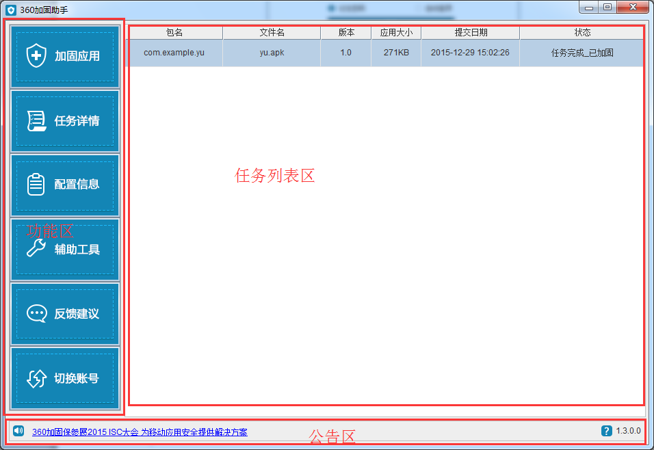 360加固助手主界面支持任意拖拽,主要分三大區(qū)域。左側(cè)一欄六個按鈕為功能區(qū),顯示核心功能。右側(cè)為任務(wù)列表區(qū),顯示加固任務(wù),選中一項任務(wù),右鍵菜單項可執(zhí)行相關(guān)操作。主界面下方為公告區(qū),主要展示公告、幫助信息等。