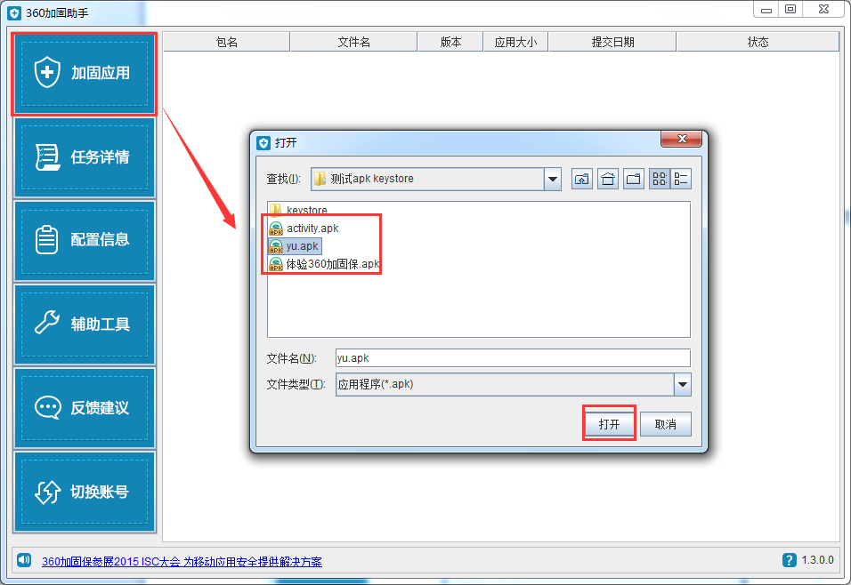 (1)主界面點擊“加固應(yīng)用”選擇要加固的apk文件。