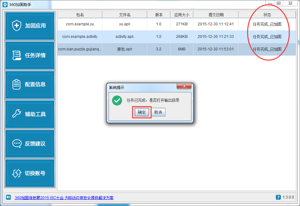 (4)加固完成后彈出提醒框。點擊“確定”打開APK輸出路徑(見下圖)。