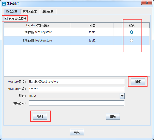 (2)勾選“啟動自動簽名”,點擊“瀏覽”按鈕,選擇Keystore文件(密鑰倉庫),輸入Keystore密碼,密碼正確后會顯示別名,然后輸入正確的別名密碼,點擊“添加”,然后單擊“確認”或關(guān)閉按鈕即可。如下圖: