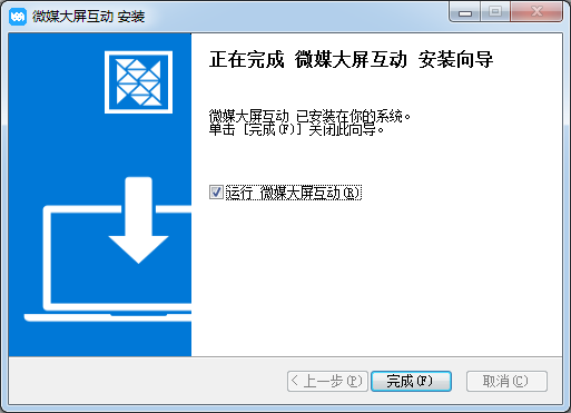 4.正在完成微媒大屏互動安裝向?qū)?,單擊完?關(guān)閉此尚導(dǎo)。