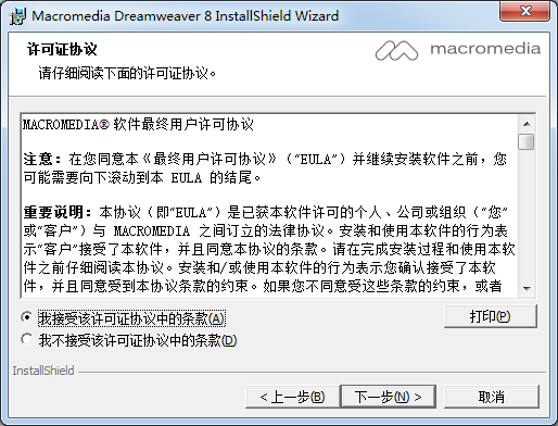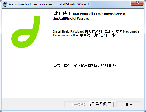 Installshield(R) Wizard將要在您的計算機中安裝MacromediaDreamweaver 8 。要維續(xù),請單擊“下—步。