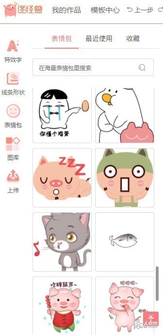 文字更換完畢后又可以在左側(cè)增加特效字、線條形狀和表情包等操作;如果自己有本地的圖片也可以通過上傳來對圖片進(jìn)行相對應(yīng)的設(shè)計;