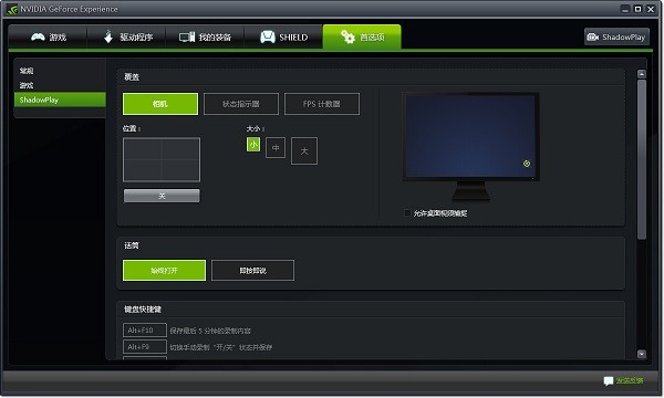 彈出了ShadownPlay設(shè)置界面,點擊界面左邊的按鈕,打開錄制功能。