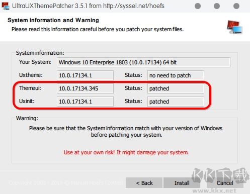 如果安裝本補(bǔ)丁后應(yīng)用主題無(wú)效,請(qǐng)?jiān)俅未蜷_(kāi)安裝程序,停留在破解詳情界面(如下圖),看下面紅色框內(nèi)的項(xiàng)是否顯示的是 patched