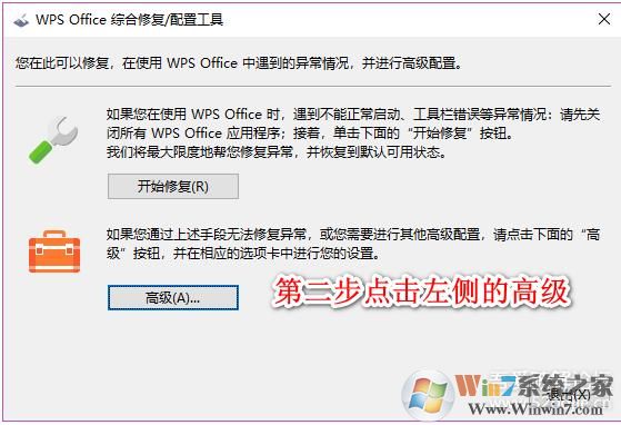 2、然后會(huì)出現(xiàn)以下WPS Office綜合修復(fù)/配置工具窗口,點(diǎn)擊下方的高級(jí)按鈕;