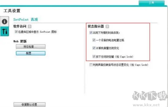3.接下來,我們還可以設(shè)置Logitech Setpoint的狀態(tài)指示器。比如說當(dāng)電腦的電量不足、音量變化、按鎖定鍵時(shí)有提示的話,就可以勾選“一個(gè)設(shè)備的電池電量過低”、“計(jì)算機(jī)音量出現(xiàn)變化”、“按下任何鎖定鍵”這三項(xiàng)內(nèi)容。