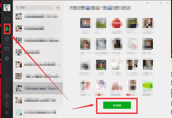 5.群發(fā)群/好友消息前,請(qǐng)先點(diǎn)擊左面的通訊錄,然后選擇一個(gè)群/好友,然后點(diǎn)發(fā)消息到聊天界面