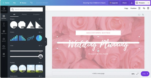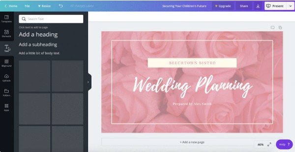 如果想要添加新文字,你可以點擊側(cè)面板的“文字”標簽。從 “添加標題”、 “添加副標題” 或 “添加少量正文文本” 選項中選擇,以在頁面上添加新的文字框。