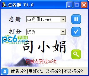 KKX為大家分享的【隨機(jī)點(diǎn)名器】是專為教師打造的一款點(diǎn)名工具,也可用于其他相關(guān)途徑。這款點(diǎn)名器能夠保證隨機(jī)點(diǎn)名,并記錄點(diǎn)到次數(shù),每次回答,老師可以為學(xué)生進(jìn)行評(píng)分,有優(yōu)秀、良好、及格和不及格4種。使用簡(jiǎn)單,在點(diǎn)名冊(cè)中輸入需要點(diǎn)名人的名字,然后打開點(diǎn)名器就可以開始點(diǎn)名了!