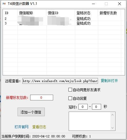 T4微信計(jì)數(shù)器是一款非常不錯(cuò)的微信計(jì)數(shù)統(tǒng)計(jì)軟件,該工具采用的是本地記錄和遠(yuǎn)程分離的設(shè)計(jì),能夠幫助我們添加微信后可以看到多個(gè)ID的記錄,并且還具備了自動(dòng)同意好友請(qǐng)求和自動(dòng)回復(fù)的功能!
