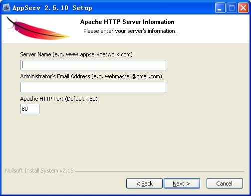 4、填寫服務(wù)器名稱,郵箱資料。如果您是本機(jī)使用,填localhost即可,郵箱填自己的郵箱,默認(rèn)端口為80,如果您之前有安裝類似的工具,占用了80端口,建議更換為其他端口即可。