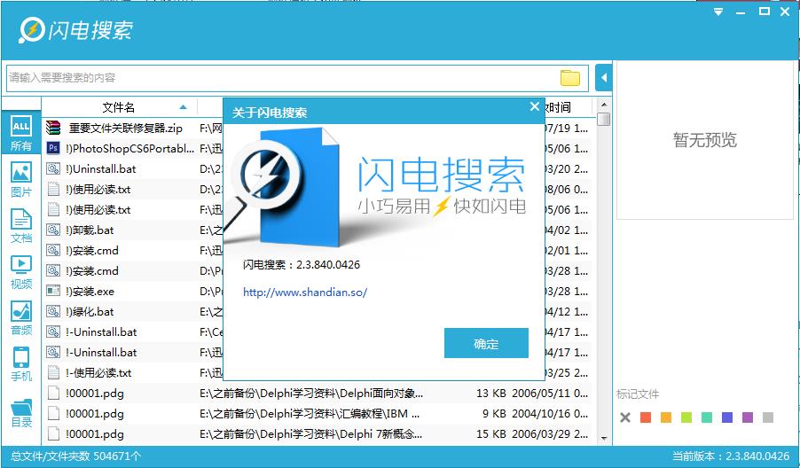 4、閃電搜索則帶有文件類別篩選及預(yù)覽功能,可方便用戶進行大類篩選還能預(yù)覽圖片及視頻文件,比較的方便。此外閃電搜索的文件分類除了常見的圖片、文檔、視頻、音頻分類外還有時下常見的手機應(yīng)用格式文件分類。還提供了文件相關(guān)信息比如文件大小、圖片尺寸等較為實用。
