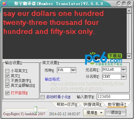 數(shù)字翻譯器是可以將阿拉伯?dāng)?shù)字轉(zhuǎn)換成英文的一款實用工具,軟件可以參照商務(wù)英語慣用方式,可以生成標準的英文金額,功能非常的實用。KK下載站為您提供數(shù)字翻譯器 綠色版下載,有需要的朋友可以下載使用哦!