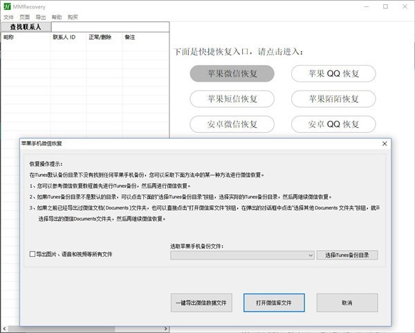3.運(yùn)行微信恢復(fù)工具M(jìn)MRecovery,點(diǎn)擊“文件”菜單,再點(diǎn)擊“微信恢復(fù)向?qū)?rdquo;,點(diǎn)擊“蘋果設(shè)備恢復(fù)向?qū)?rdquo;,將會(huì)彈出“微信恢復(fù)向?qū)?rdquo;對(duì)話框。