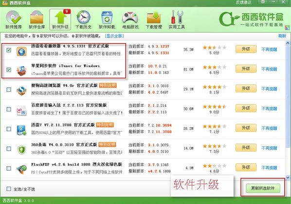 2、智能升級(jí)軟件有新版本時(shí),西西軟件盒將第一時(shí)間提示您,讓您免于過期軟件帶來(lái)的各種潛在風(fēng)險(xiǎn)。內(nèi)置一鍵批量升級(jí)功能,告別手動(dòng)升級(jí)的繁瑣操作。