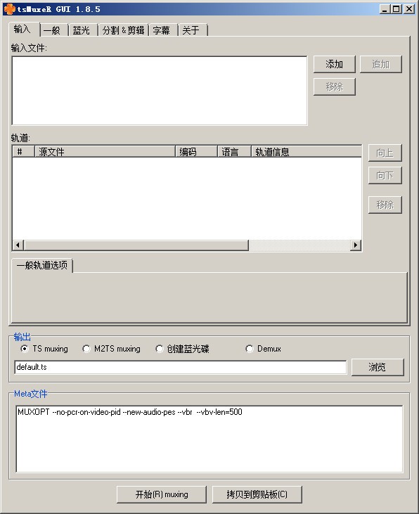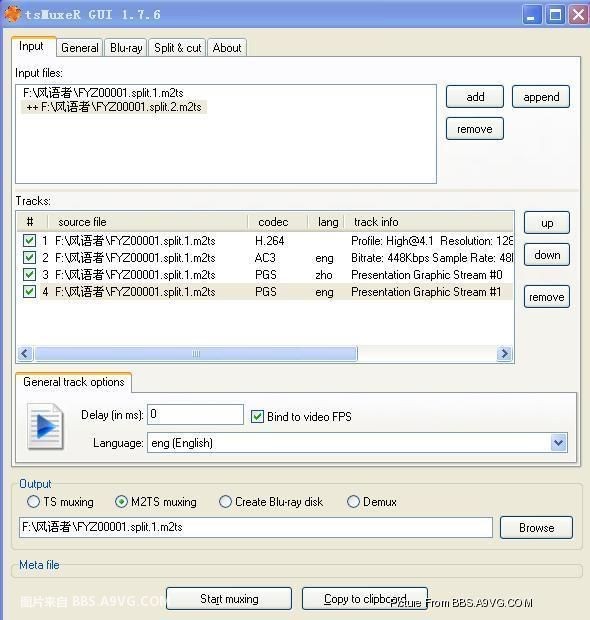 利用tsMuxerGUI合并分割過(guò)的m2ts文件的教程 1、完整下載下來(lái)的一部影片應(yīng)該包含這3個(gè)文件 2、打開(kāi)tsMuxerGUI,按add添加第一個(gè)文件FYZ00001.split.1.m2ts 注意:添加第2個(gè)文件FYZ00001.split.2.m2ts一定要按append這個(gè)按鍵追加,把2個(gè)文件添加好后,下面的輸出選擇M2TS muxing,然后選擇輸出路徑后按Star muxing即可完成合并。m.qabbs.com 關(guān)于文件名:下載下來(lái)的視頻文件名里有個(gè)5位數(shù)的數(shù)字,這個(gè)數(shù)字如果是00000,就把合并好的文件改名為00000.m2ts,如果是00001,就把合并好的文件改名為00001.m2ts.風(fēng)語(yǔ)者下載下來(lái)的文件名是FYZ00001.split.1.m2ts和FYZ00001.split.2.m2ts,所以我們把合并好的文件改名為00001.m2ts 3、下載得到的壓縮包解壓得到文件夾BDMV,把合并好的00001.m2ts文件拷貝進(jìn)BDMV/STREAM里面即可,下面就是把BDMV刻碟播放了 以上便是kk為大家分享介紹的tsMuxeRgui中文版。