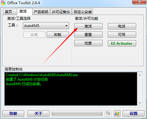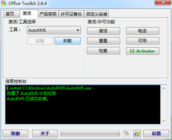 1、運(yùn)行軟件,選擇你需要激活Office或Windows,點(diǎn)擊Office圖標(biāo)或Windows圖標(biāo)。 2、切換到激活頁面,選擇AutoKMS點(diǎn)擊安裝,安裝AtuoKMS之后激活到期會(huì)自動(dòng)續(xù)期。 3、軟件會(huì)創(chuàng)建計(jì)劃任務(wù)用于KMS激活,建議安裝前不要運(yùn)行安全軟件。 4、安裝成功后,點(diǎn)擊激活 5、等待一會(huì)就可以完美激活你的系統(tǒng)或office軟件。 Project2010激活工具使用比較簡(jiǎn)單的,同時(shí)還有很多可以激活Project2010的激活工具,大家可以搜索本站!