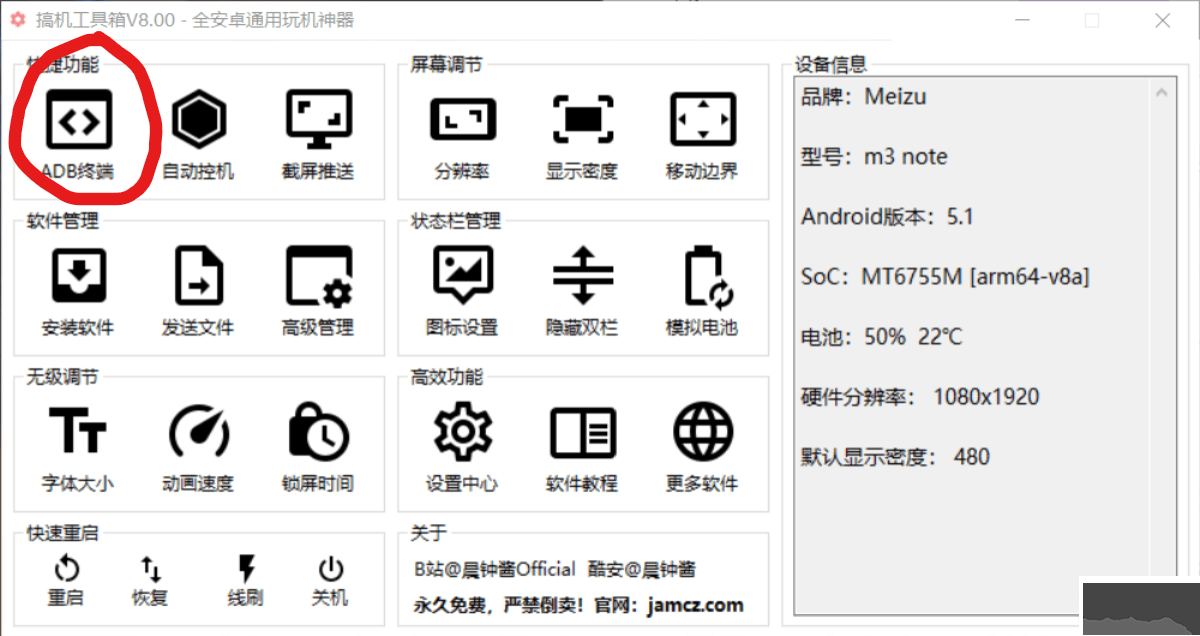 第四步,應(yīng)該可以進(jìn)入主界面了,否則會(huì)提示找不到設(shè)備,而自動(dòng)關(guān)閉程序。例如我的魅族flyme,USB調(diào)試路徑則在設(shè)置——輔助功能——開發(fā)者選項(xiàng)里面。不同的手機(jī)的路徑不一樣,但是都可以通過連續(xù)點(diǎn)擊系統(tǒng)版本號(hào)打開開發(fā)者選項(xiàng)的入口。