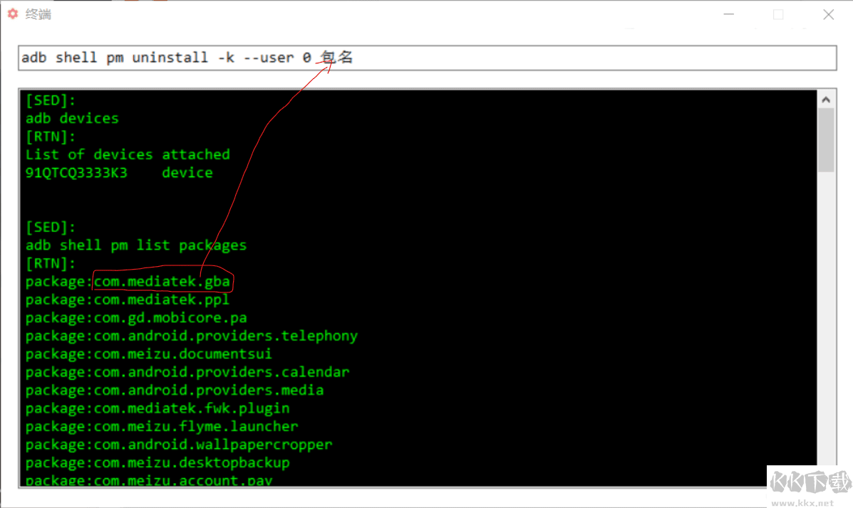 adb shell pm uninstall -k --user 0 包名(例如:com.mediatek.gba)