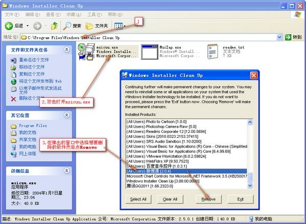 2.此時在C:\Program Files\Windows Installer Clean Up下有個msicuu.exe,打開運行即可; 3.最后選中你要刪除的軟件,點remove即可。 找不到怎么辦?直接打開開始菜單,搜索:clean 時刻找到,打開即可使用!