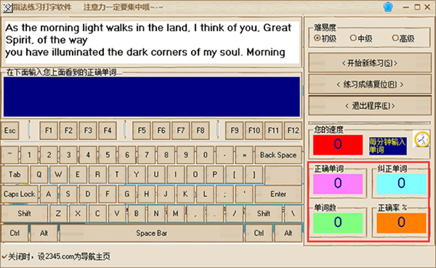 3、在指法練習(xí)打字軟件界面的右下角,會(huì)實(shí)時(shí)顯示您的打字練習(xí)相關(guān)數(shù)據(jù),包括打字速度、正確率等,對(duì)結(jié)果滿意的話您就可以試著調(diào)高難度了,快來試試吧。