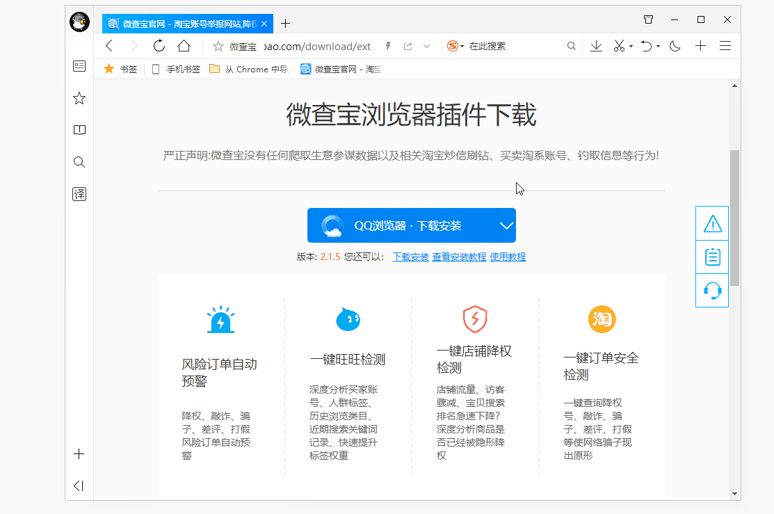 3、添加成功后即可在瀏覽器插件欄看到微查寶的插件,再進(jìn)入淘寶店鋪的賣(mài)家中心,點(diǎn)擊微查寶的插件就可以看到“檢測(cè)店鋪降權(quán)號(hào)”,可以一鍵檢測(cè)店鋪降權(quán)號(hào)并標(biāo)記。