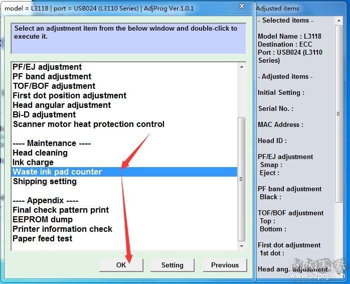 3.選擇[Waste ink pad counter]然后點(diǎn)[OK]. 如下圖。