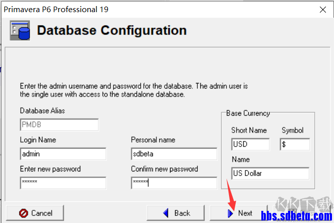 7、在這里,您可以按照意愿放置登錄名,個人名和密碼,但更喜歡在每個單元格中都放置admin。保留“基礎(chǔ)貨幣”部分。打下一個