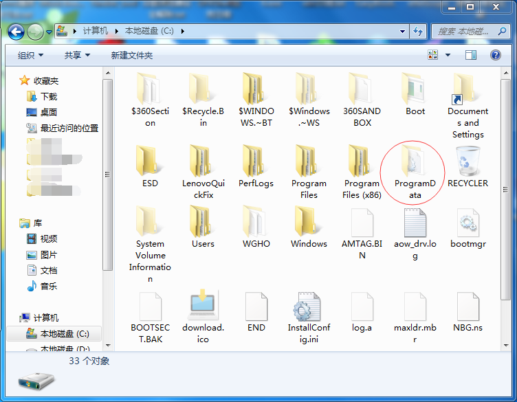 注意:ProgramData目錄是系統(tǒng)隱藏目錄,在取消隱藏系統(tǒng)受保護(hù)文件和隱藏文件之后就可以看到了。
