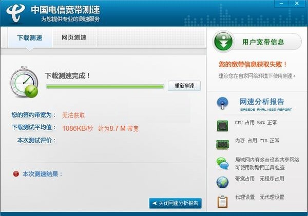 下載速率:也就是您本次的測試結(jié)果。指通過網(wǎng)絡(luò)協(xié)議對網(wǎng)絡(luò)資源進行下載這一過程中的數(shù)據(jù)傳輸速度,通常用于衡量從用戶電腦到資源下載點之間端到端的性能。 由于網(wǎng)絡(luò)傳輸損耗和其他非本省電信因素影響,通常情況下您的測試結(jié)果有時會略低于您的簽約帶寬。
