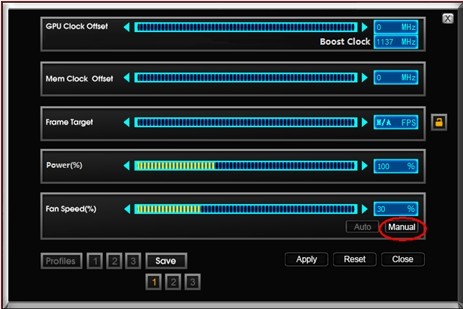 現(xiàn)在玩家們可以開始自由發(fā)揮啦,選擇自己想要的頻率和電壓以及顯卡風(fēng)扇轉(zhuǎn)速,點(diǎn)擊Apply應(yīng)用,如想恢復(fù)默認(rèn)設(shè)置,點(diǎn)擊Reset即可。