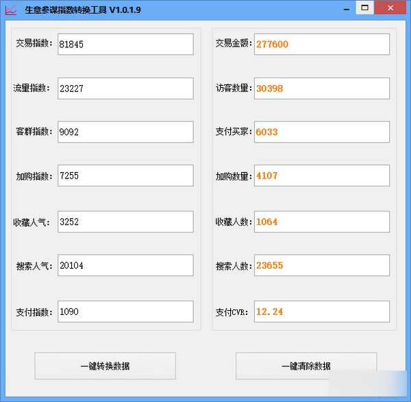 生意參謀指數(shù)轉換工具是一款針對淘寶商家使用的支持交易指數(shù)、流量指數(shù)、客群指數(shù)、加購指數(shù)、收藏人氣、搜索人氣、支付指數(shù)等,一是比較穩(wěn)定,二是數(shù)據(jù)相對比較精準,三是功能比較齊全,支持一鍵轉換數(shù)據(jù)、一鍵清除數(shù)據(jù)的操作,功能非常強大!