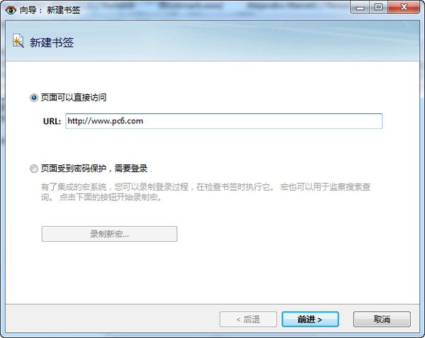 使用之前,你首先需要設(shè)定需要跟進(jìn)的網(wǎng)站地址,在書簽中使用新建功能就可以了,鏈接地址可以是網(wǎng)站地址,如www.pc6.com,或者是某一個(gè)特定網(wǎng)頁(yè)的地址。之后,你的所有工作就完成了,交給WebSite-Watche吧。