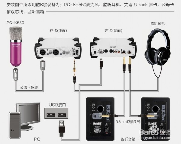 第一步:安裝聲卡外部線路,聲卡如何連接電腦,以及電容麥和耳機的插法,如KKX小編分享的圖片所示: