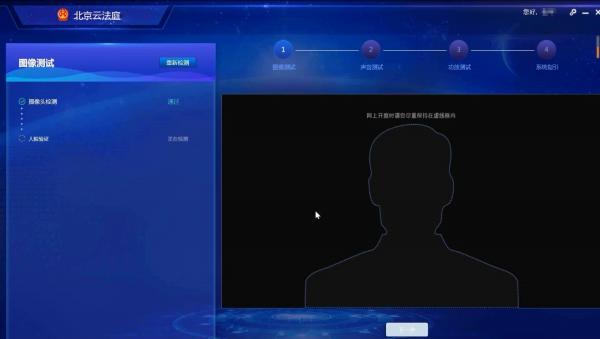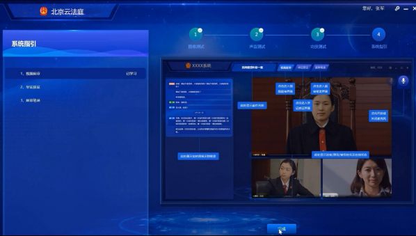 第三步 當(dāng)事人登錄北京云法庭客戶端時(shí)需要進(jìn)行檢測,檢測電腦設(shè)備是否滿足庭審要求當(dāng)事人登錄后,進(jìn)入到庭審檢測頁面,分別對圖像、聲音、功放,進(jìn)行檢測,檢測成功后,給與系統(tǒng)引導(dǎo)圖,便于當(dāng)事人了解系統(tǒng)如何使用。