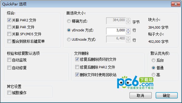 1、運行QuickPar,即進入如下的選項界面,可以對綜合、首選塊大小、檢驗和修復(fù)默認選項、文件刪除等參數(shù)進行設(shè)置。