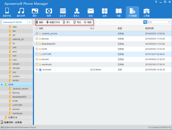 文件管理:根據(jù)文件系統(tǒng),文件管理功能將手機里面的文件歸為3大類:手機內存、SD卡、擴展SD卡。對于這三大路徑下的任何文件,您可對其進行導入、導出、刪除、查看、刷新操作。此功能也支持新建文件夾在這3大類的目錄下或者是通過搜索功能快速找到您想要的文件。