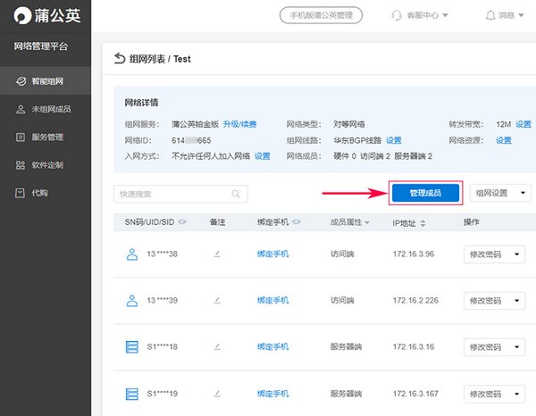 點(diǎn)擊【查看網(wǎng)絡(luò)】,跳到蒲公英組網(wǎng)管理界面,點(diǎn)擊【查看詳情】即可查看組網(wǎng)成員;