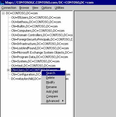 你還可以使用LDP進(jìn)行搜索, 這個(gè)工具包含在Microsoft Windows Server™ 2003 和 Windows® 2000 Server support tools中. 這個(gè)工具給予你不僅僅是搜索domain container的能力, 還有搜索Configuration container的能力. 你首先會(huì)打開(kāi)LDP, 然后連接到合法的domain controller上. 然后你需要使用合適的credential來(lái)綁定. 選擇View, 然后選擇Tree. 保持Base DN欄為空, 點(diǎn)擊OK.導(dǎo)航到你想要搜索的container上, 右擊container, 然后選擇Search.