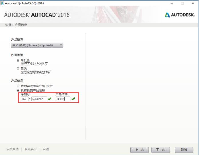 3、進(jìn)入AutoCAD2016用戶許可協(xié)議界面中勾選“我接受”,然后點擊【下一步】,這時來到產(chǎn)品信息界面,需要我們輸入序列號和產(chǎn)品密鑰。