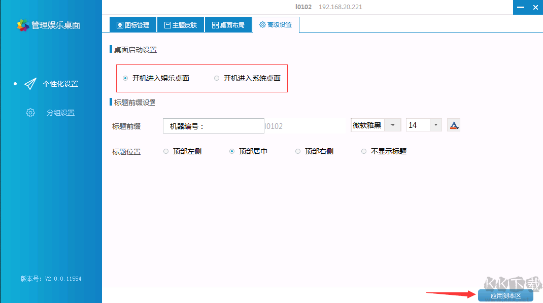 在桌面啟動設置中設置開機進入娛樂桌面或者開機進入系統(tǒng)桌面。最后點擊應用到本區(qū)就可以了。