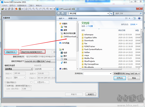 4、我們點擊“增加文件”或者“添加目錄中的圖形文件”按鈕,在呼出的打開窗口中選擇autocad文件;