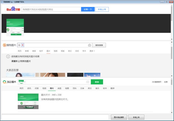 在線智能識(shí)圖以圖識(shí)圖軟件是一款網(wǎng)友自行開發(fā)的一款可以用來識(shí)圖的工具,該工具調(diào)用了百度,搜狗,360搜索引擎以圖識(shí)圖支持網(wǎng)頁圖片鏈接跟本地圖片上傳,幫助你找圖視圖,3秒找打相似圖片,提升你的工作效率!