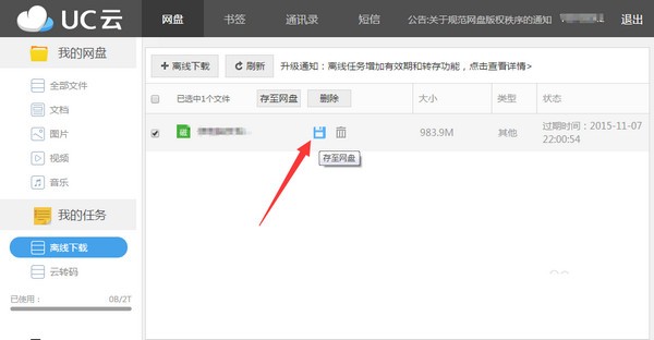 7、待對應(yīng)的離線任務(wù)下載完成后,將鼠標移動到對應(yīng)的離線任務(wù)上,從顯示的面板中點擊“存在網(wǎng)盤”按鈕。