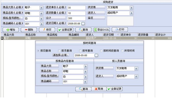 1、 增加:在界面上方錄入商品編碼,退貨單價(jià),退貨數(shù)量,退貨日期, 供貨商等內(nèi)容后按“增加”即可實(shí)現(xiàn)商品的 退貨進(jìn)貨登記。